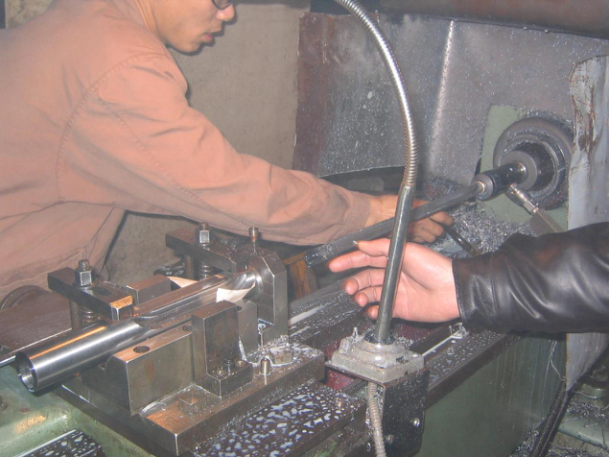 2、根據(jù)實際情況設(shè)計工裝,將工件固定在機(jī)床中托板上。并可以設(shè)計導(dǎo)向套安裝在工件前端面,引導(dǎo)深孔鉆進(jìn)入。此種方法不需在深孔加工前加工引導(dǎo)孔。大大提高了加工效率。改造深孔鉆鏜床刀具的安裝可根據(jù)工件的實際情況選擇方式:機(jī)床轉(zhuǎn)速和最小進(jìn)給量都能滿足加工要求時,旋轉(zhuǎn)夾具錐柄直接安裝在機(jī)床主軸錐孔內(nèi),刀具安裝在旋轉(zhuǎn)夾具,機(jī)床主軸通過旋轉(zhuǎn)夾具帶動刀具作旋轉(zhuǎn)運(yùn)動,進(jìn)給運(yùn)動由大托板提供。