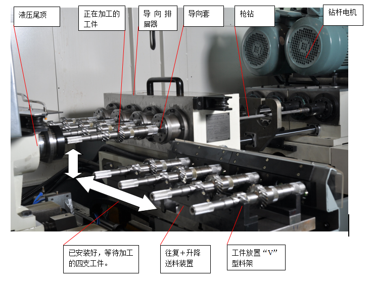 自動(dòng)進(jìn)料四軸數(shù)控深孔鉆床ZK2120×4B/500,具有高效的送料機(jī)構(gòu):送料機(jī)構(gòu)為往復(fù)+升降式復(fù)合送料機(jī)構(gòu)。送料機(jī)構(gòu)橫進(jìn)導(dǎo)軌為滾動(dòng)導(dǎo)軌,伺服控制。料架的升降為氣缸驅(qū)動(dòng)。檢測(cè)完備,運(yùn)行可靠。