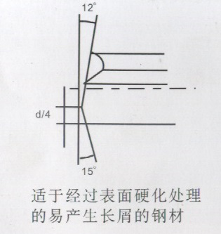 減小槍鉆內(nèi)、外刃角度,即槍鉆內(nèi)外刃磨的更平一些,對(duì)加工斷屑有很大的幫助。另外,切削線速度的提高,對(duì)斷屑效果也很明顯。加工不易斷屑材料時(shí),槍鉆端刃可以參考如下角度: